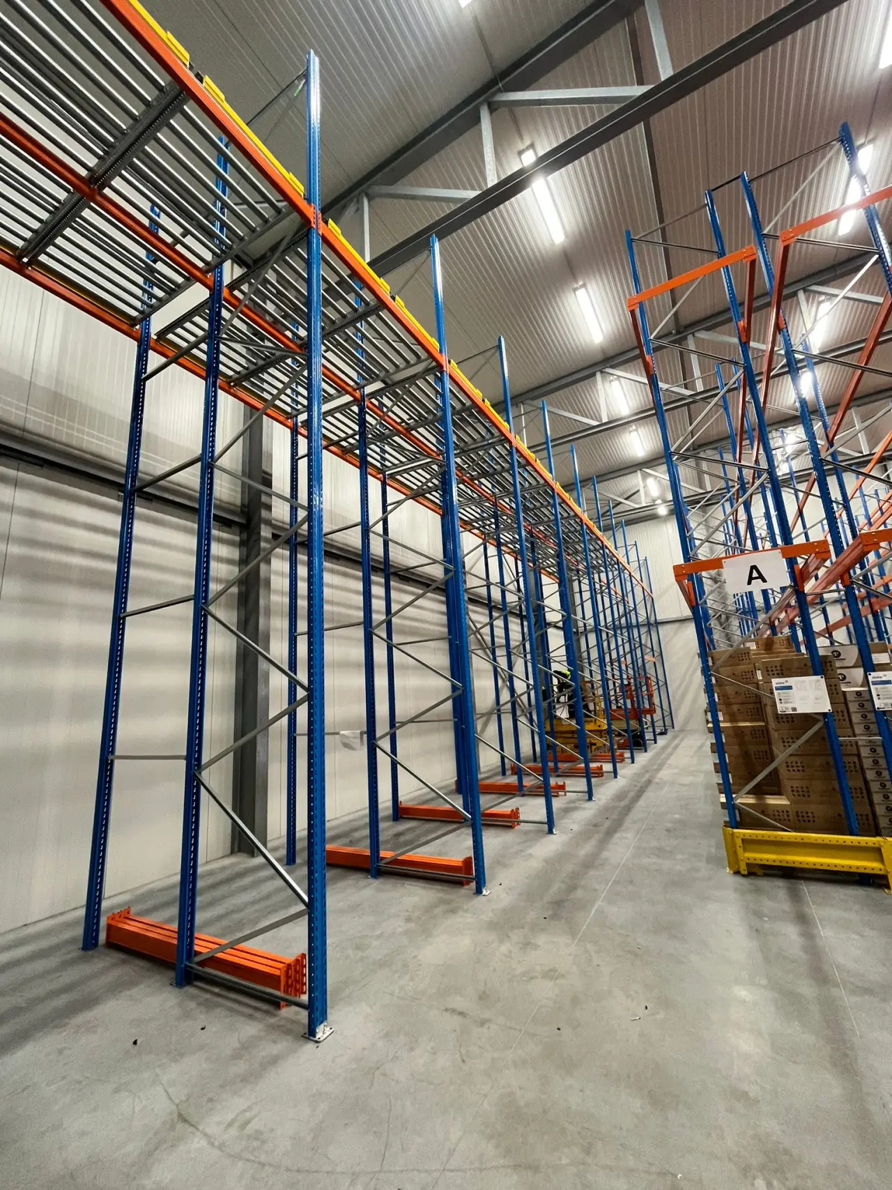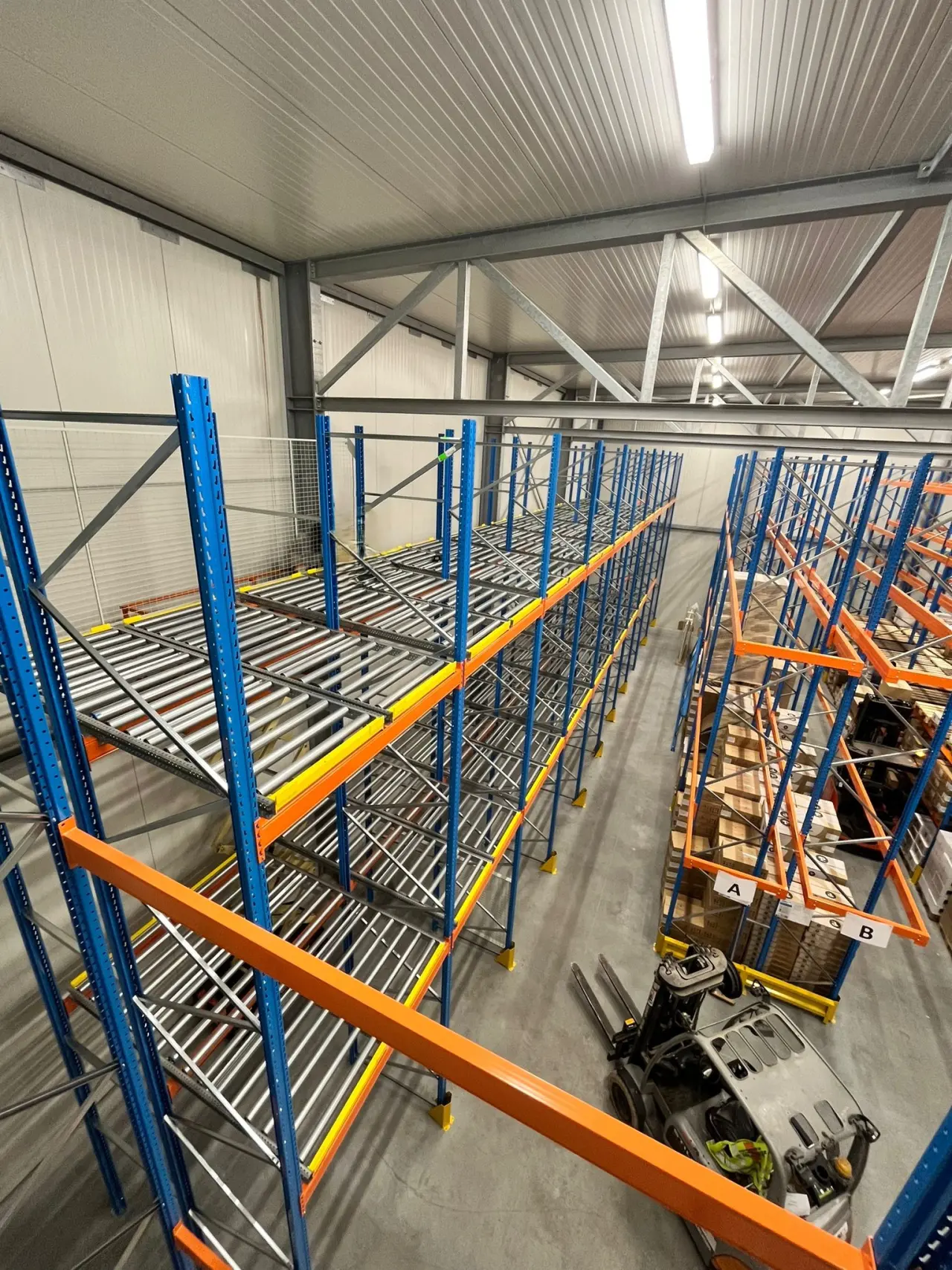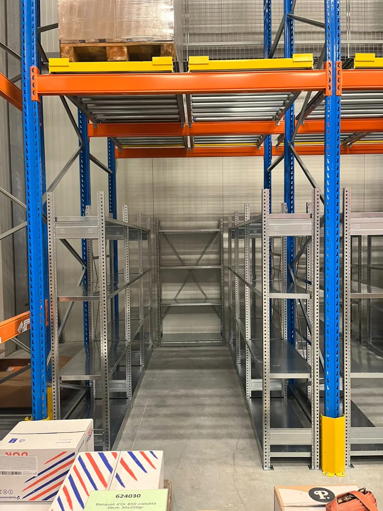 Pusher racking works according to the LIFO principle (Last In, First Out). Beneath these push-through shelving units, we installed shelving for extra storage space and flexibility. A mesh wall was also provided as fall-through protection to prevent goods from falling or damage to the wall.