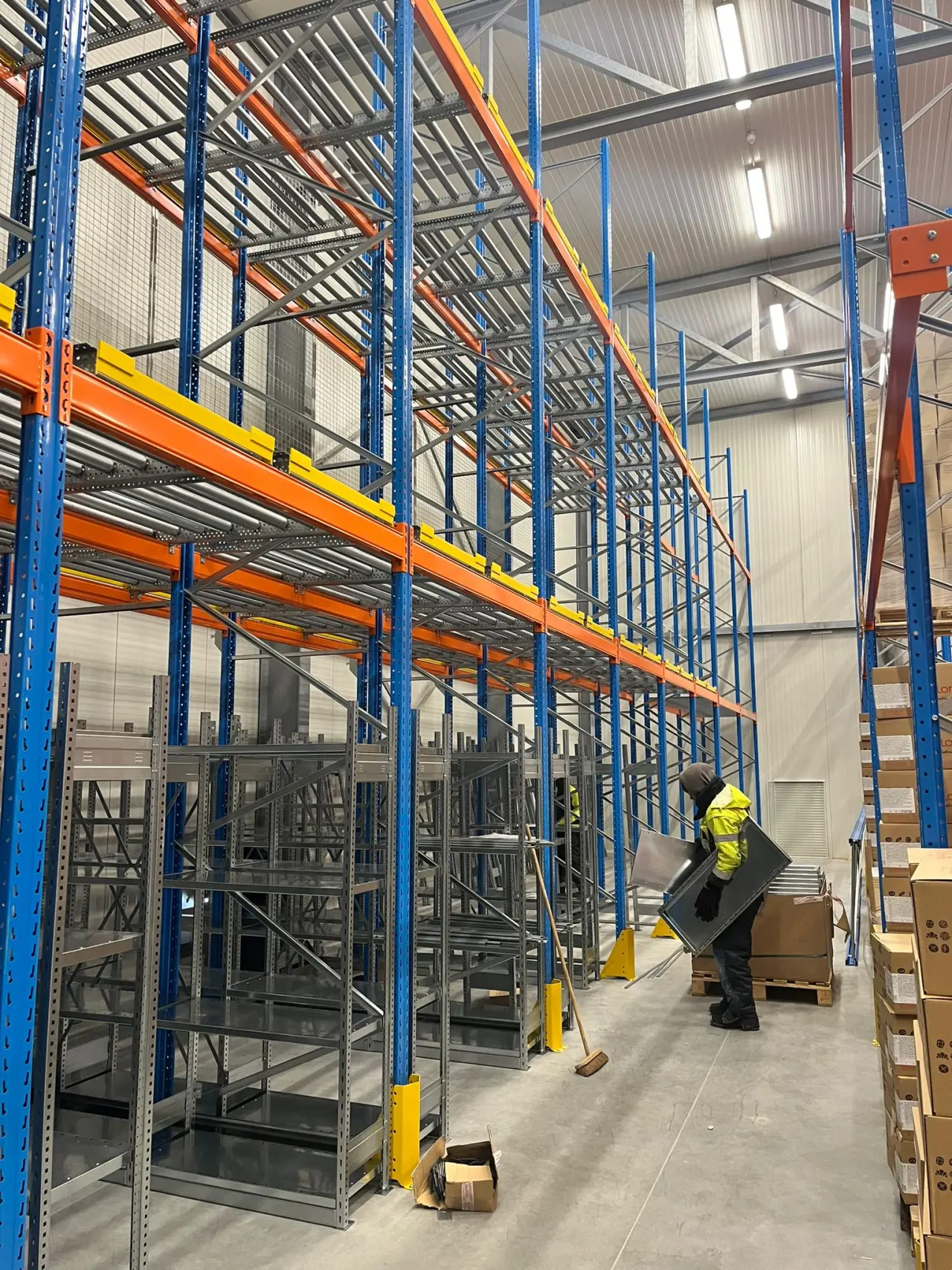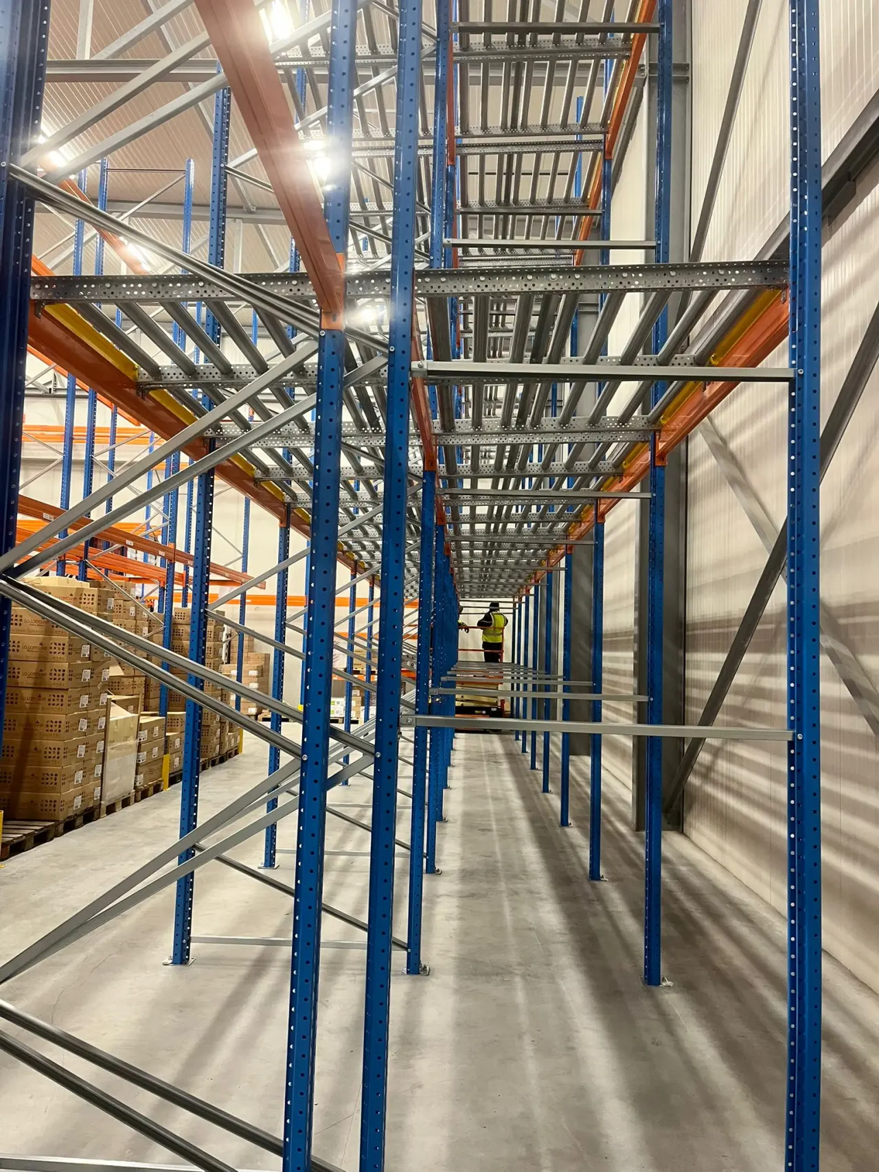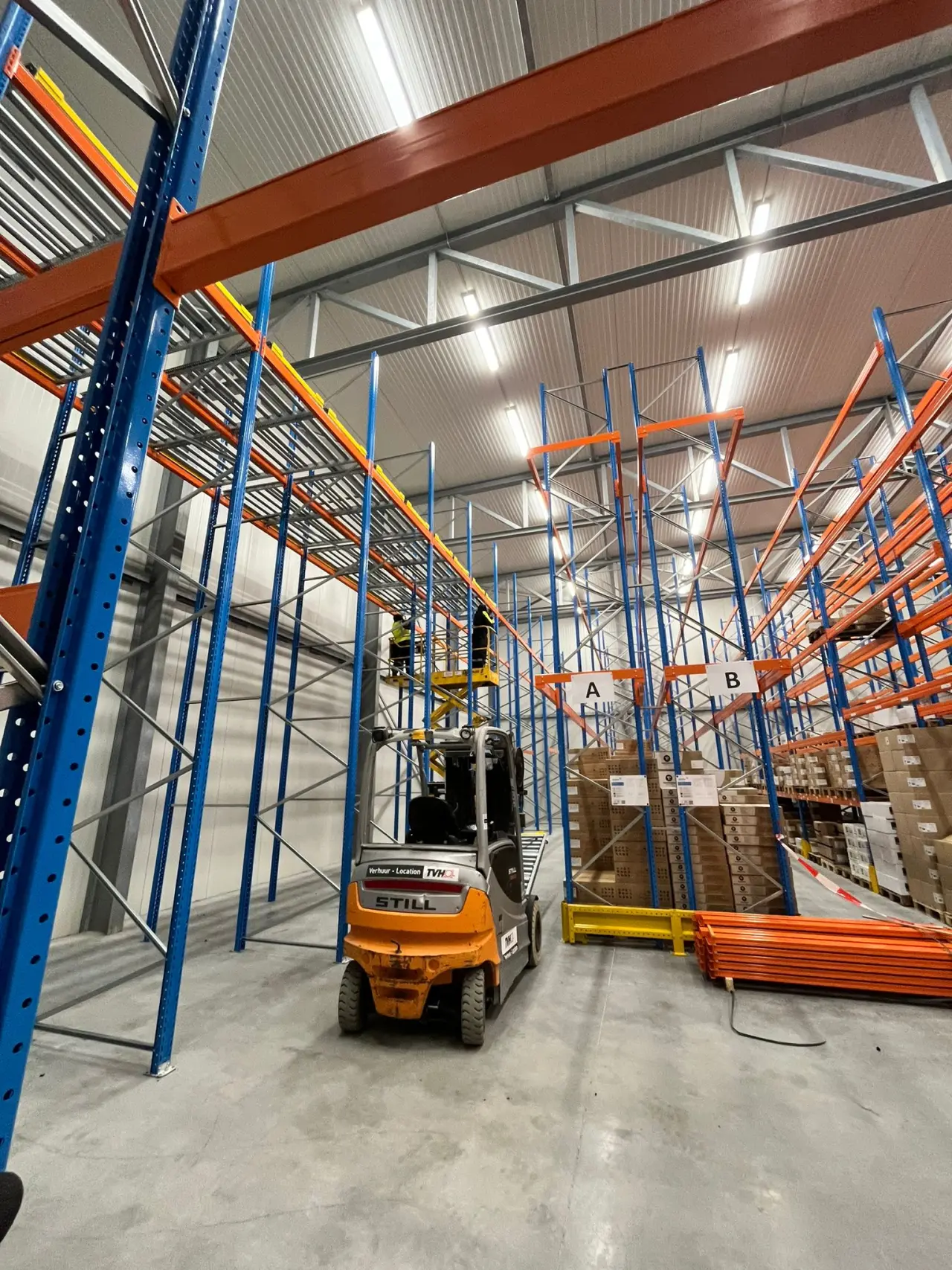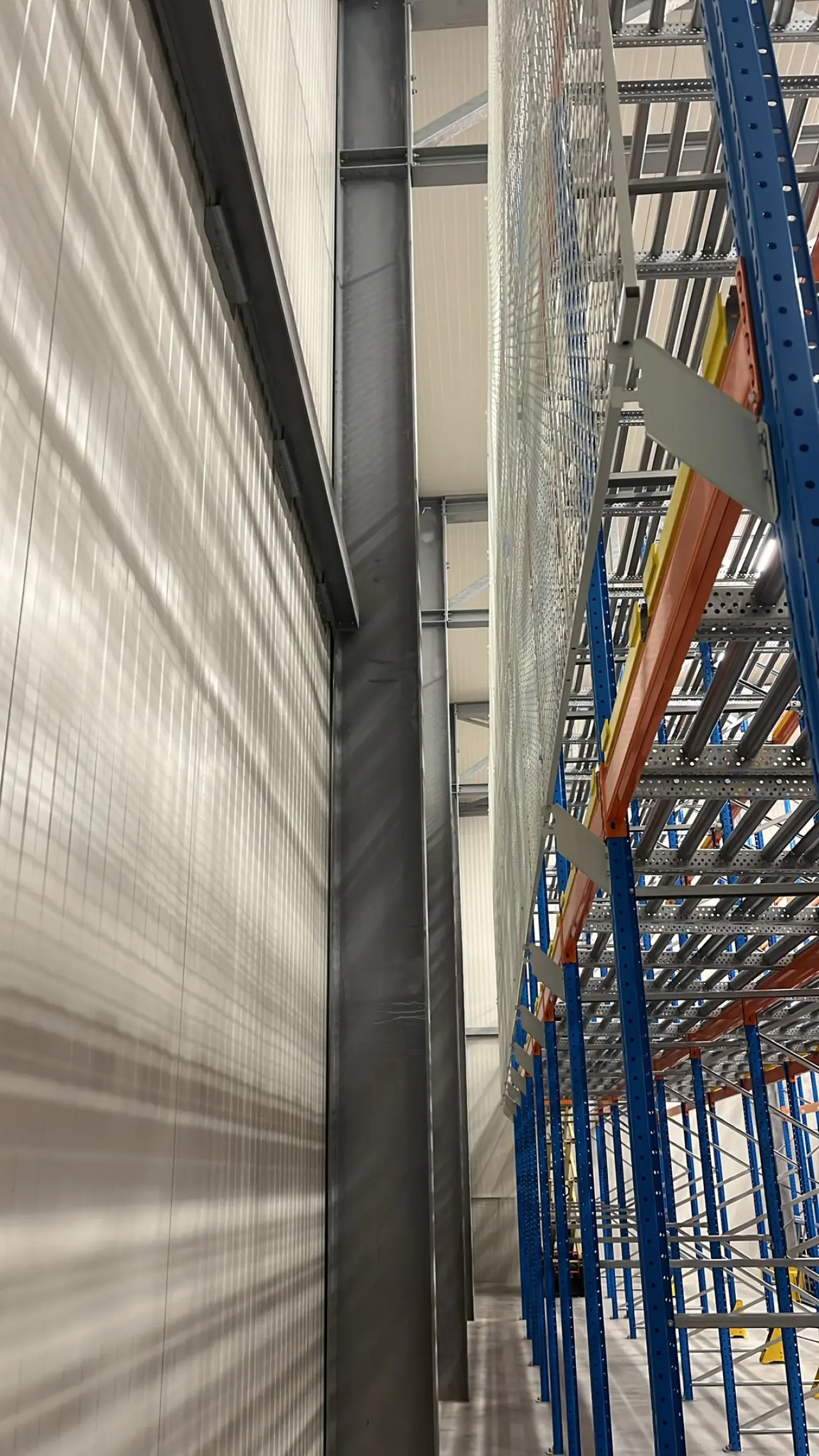 Pusher racking works according to the LIFO principle (Last In, First Out). Beneath these push-through shelving units, we installed shelving for extra storage space and flexibility. A mesh wall was also provided as fall-through protection to prevent goods from falling or damage to the wall.