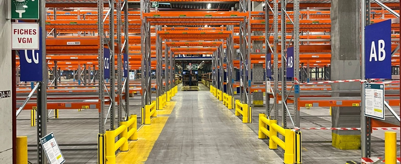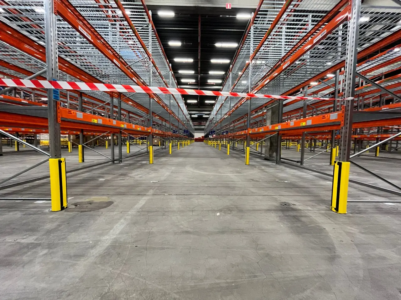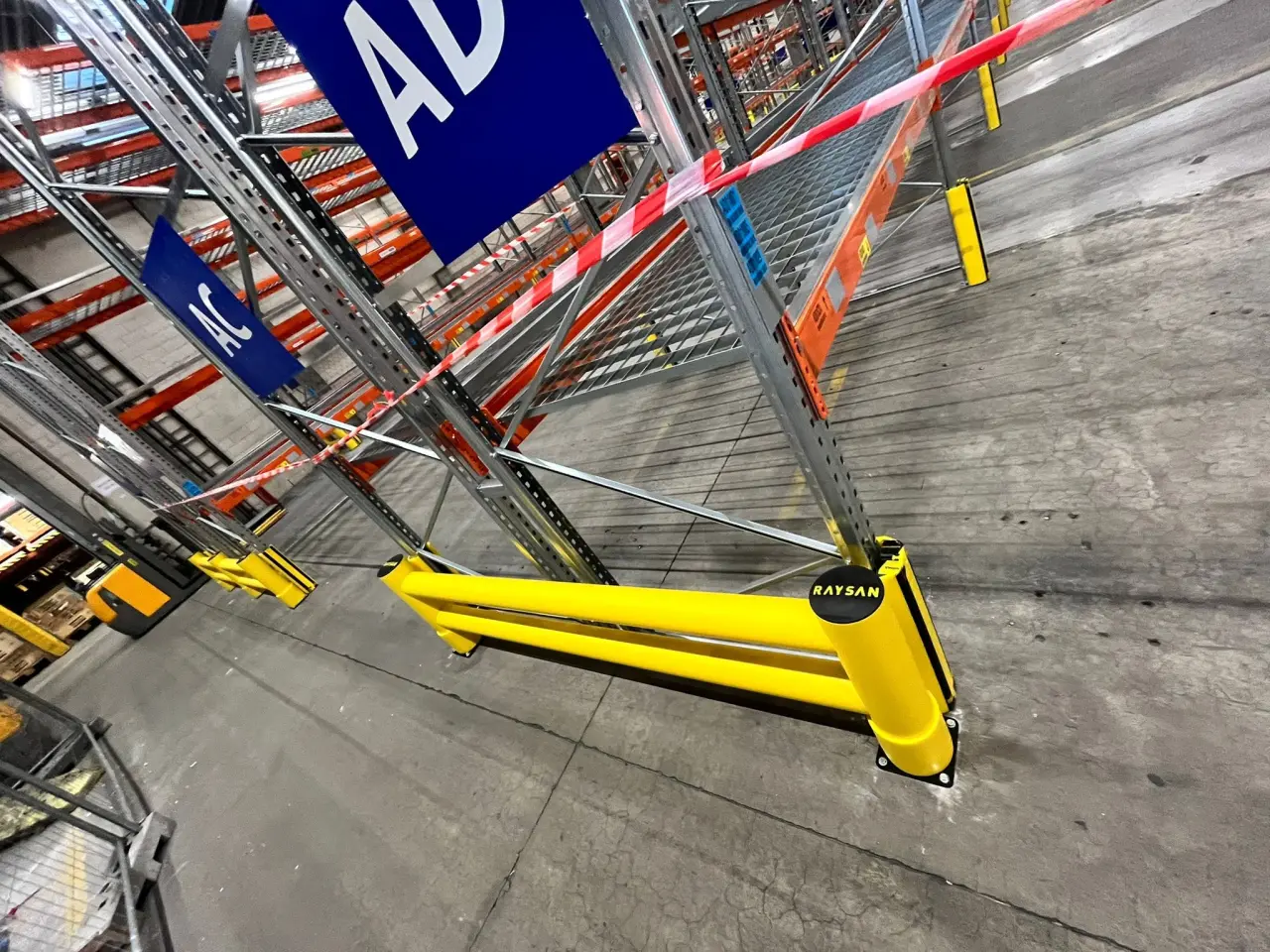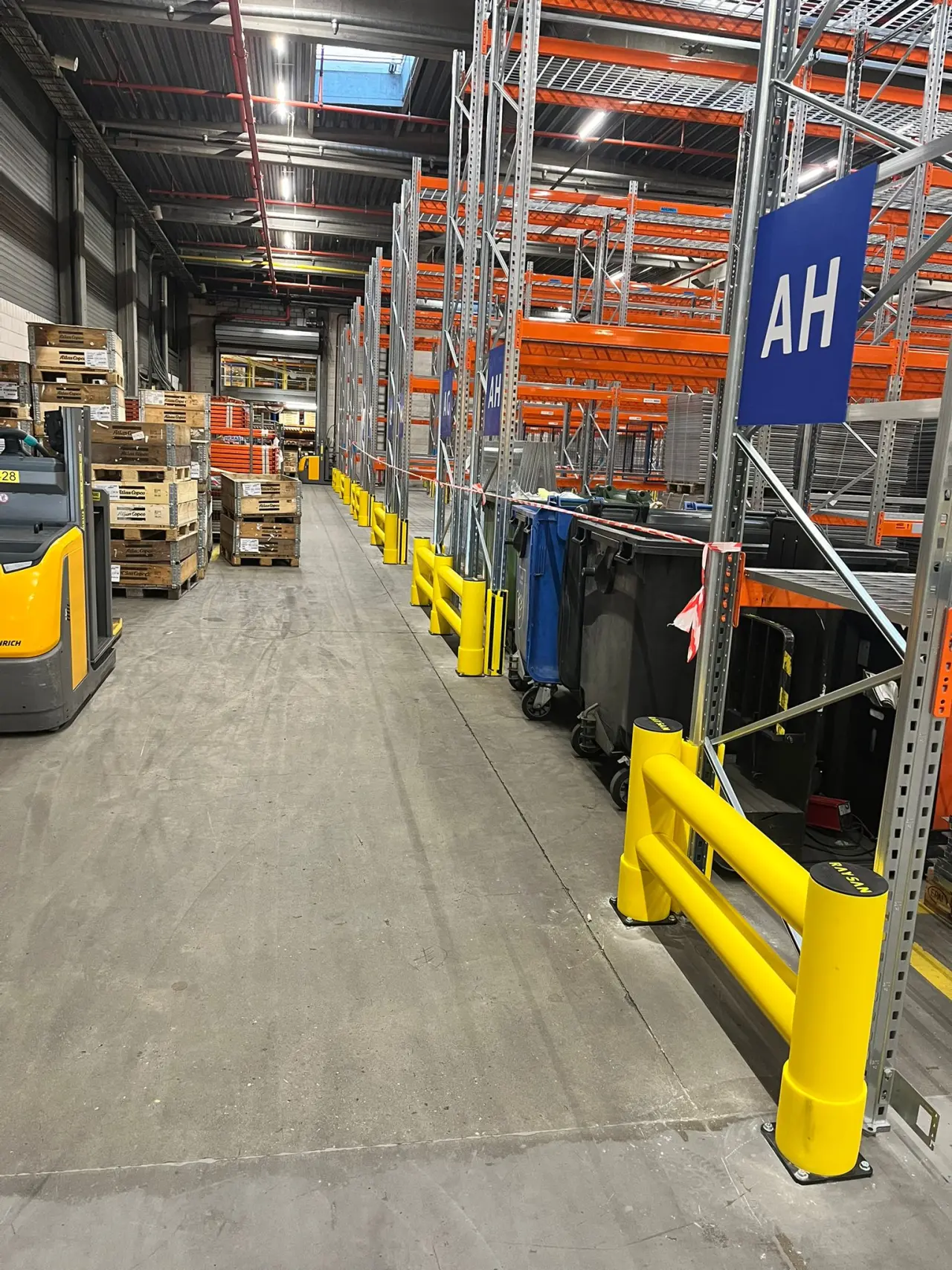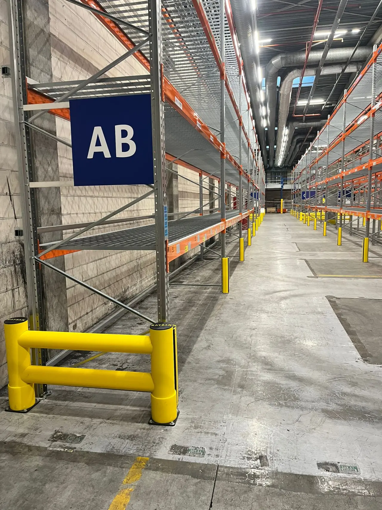 Recently, we carried out a complete installation of impact protection in a warehouse, specifically designed to protect new pallet racks from damage caused by forklifts and other vehicles. This installation included both upright protectors and end-of-aisle barriers, ensuring the racks are fully protected against impact.