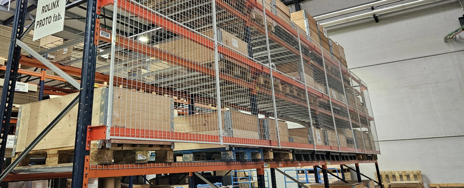 Mesh walls are seen in places where protection, demarcation and visibility are needed at the same time. For example, they are often placed behind racking to prevent goods from falling down or around machinery and equipment that not just anyone should have access to. Stock areas containing sensitive or dangerous products are also often screened with mesh walls. They are also used as partitions or warehouse fencing at mezzanines and walkways as well as to provide structure and safety in busy work areas. Our walls are modular, flexibly adaptable and sturdy enough for industrial applications. So you can turn one large space into a safe and logically arranged work environment.